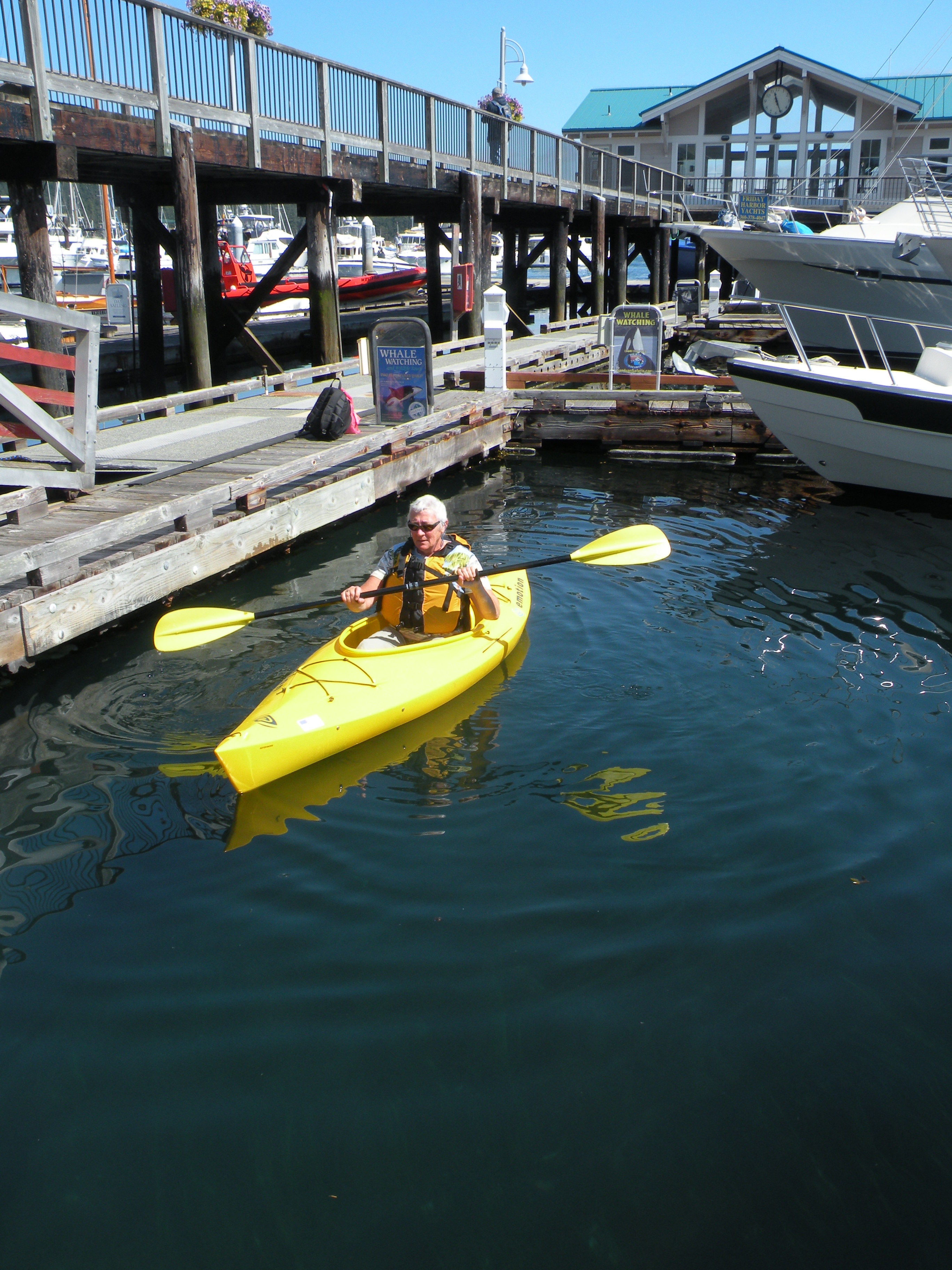 On a recent trip around San Juan Island over the long weekend we procurred our 2nd ‘alternate’ water transportation i.e. a kayak. Small though it may be it has already bucked the two of us off and into the water. As we’ve discovered balance is critical and technique even more so. Although I don’t have a picture of either one of us flailing around trying to escapte the cold Salish Sea I do have a happier looking Connie as she ventures away from the dock after carrying the kayak from the store in Friday Harbour down to the water. Her first foray off the dock and into a new era.