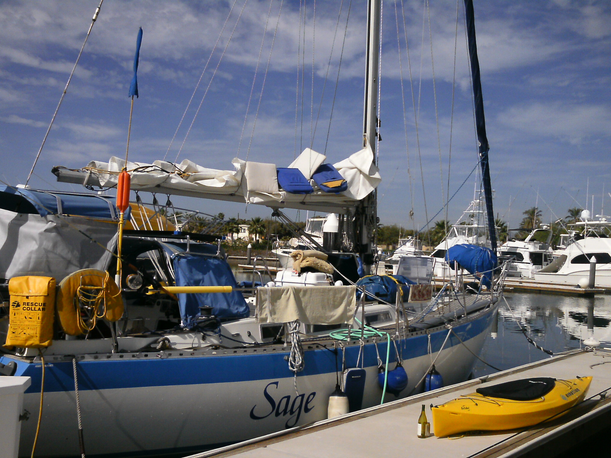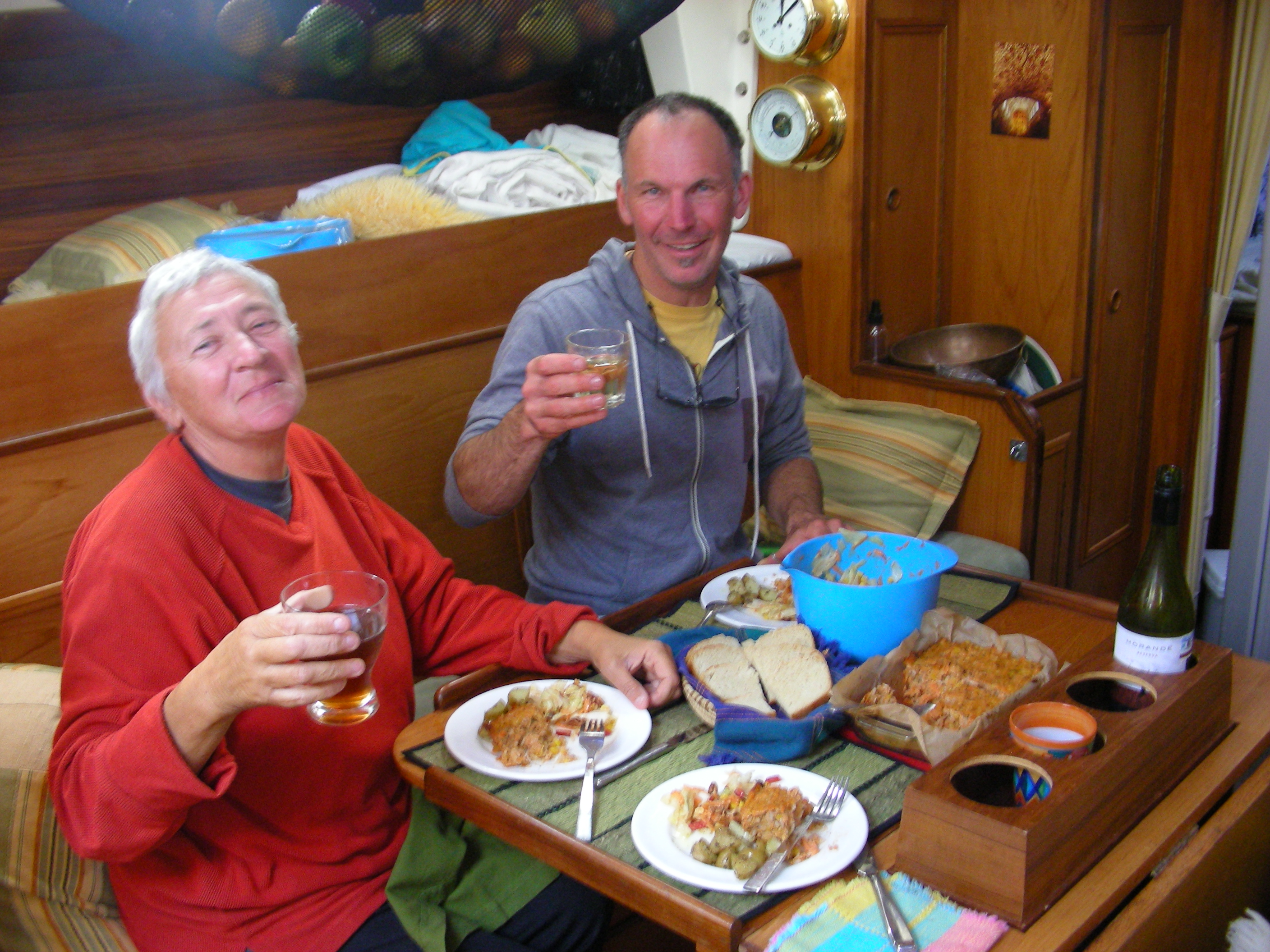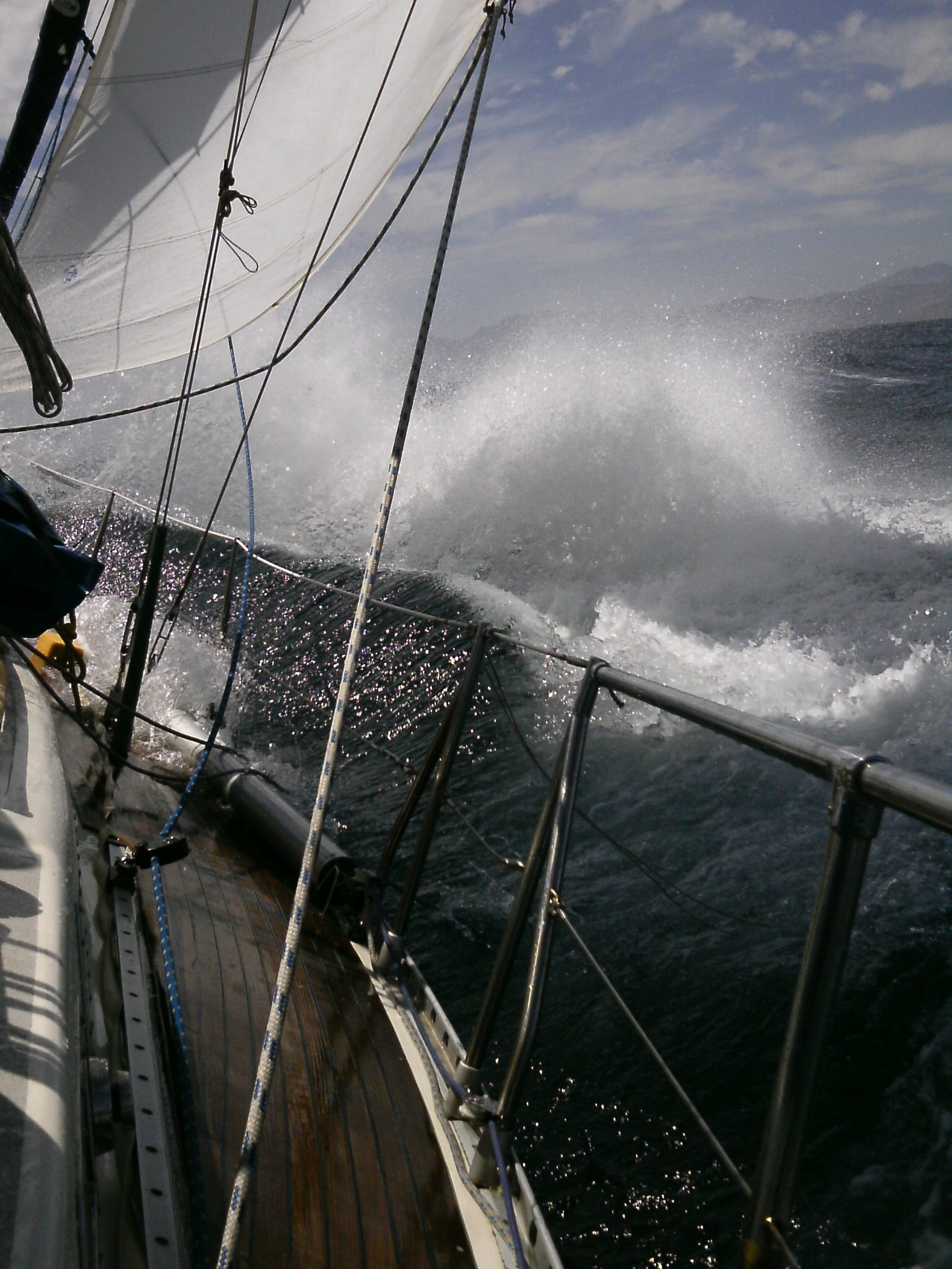 clear skies, a south west wind blowing 10 – 15 knots, the boat full of stores, electricity and water topped up and a new crew member onboard, Bill from San Francisco. Motoring out the channel from the marina we were apprehensive and excited to finally be on our way. Well, 3 hours later we were coming back in the same entranceway with our tails between our legs. Within 15 minutes of leaving the wind had risen to 25 knots accompanied by a playful sea that immediately saw everything soaked with salt water, the main settee soaked due to open hatch, eggs on the floor, egos bruised and salt ½ inch thick coating the deck, rigging, cushions and ourselves. Um, not a good beginning!