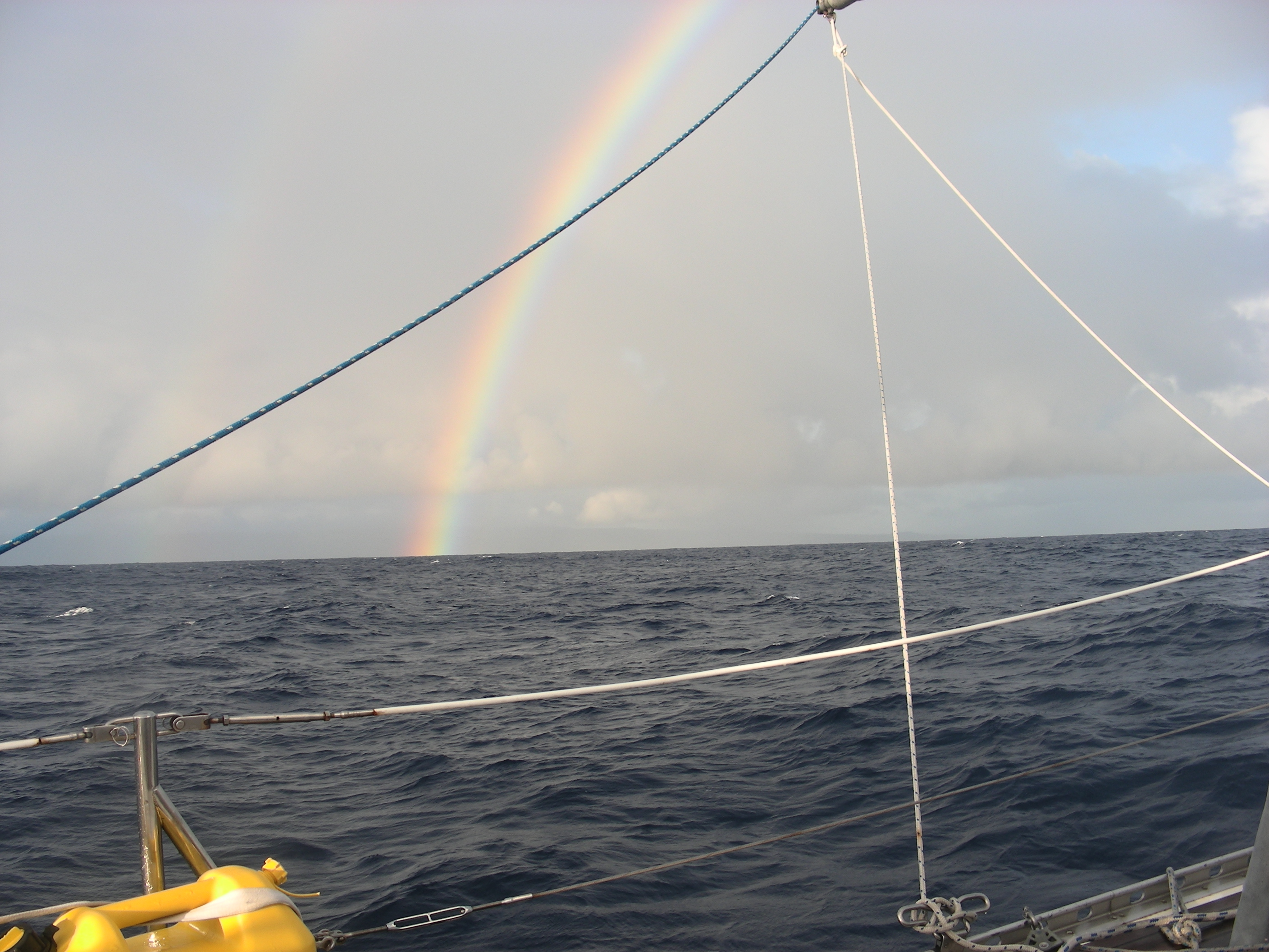 Squalls were short lived and trades settle back in for the last of the run to Hawaii. Excitement grows and the competition to see who sights land first begins. With Hawaii’s height at over 12,000 feet surely we can see it from 150 miles away. Who gets to identify it first? Bill, takes the prize. Sighted at over 60 miles the tip of Hawaii appears above the clouds. At over 10,000 feet it’s an awesome sight but it doesn’t stay visible for long. More rain squalls drive relentlessly down on Sage.