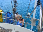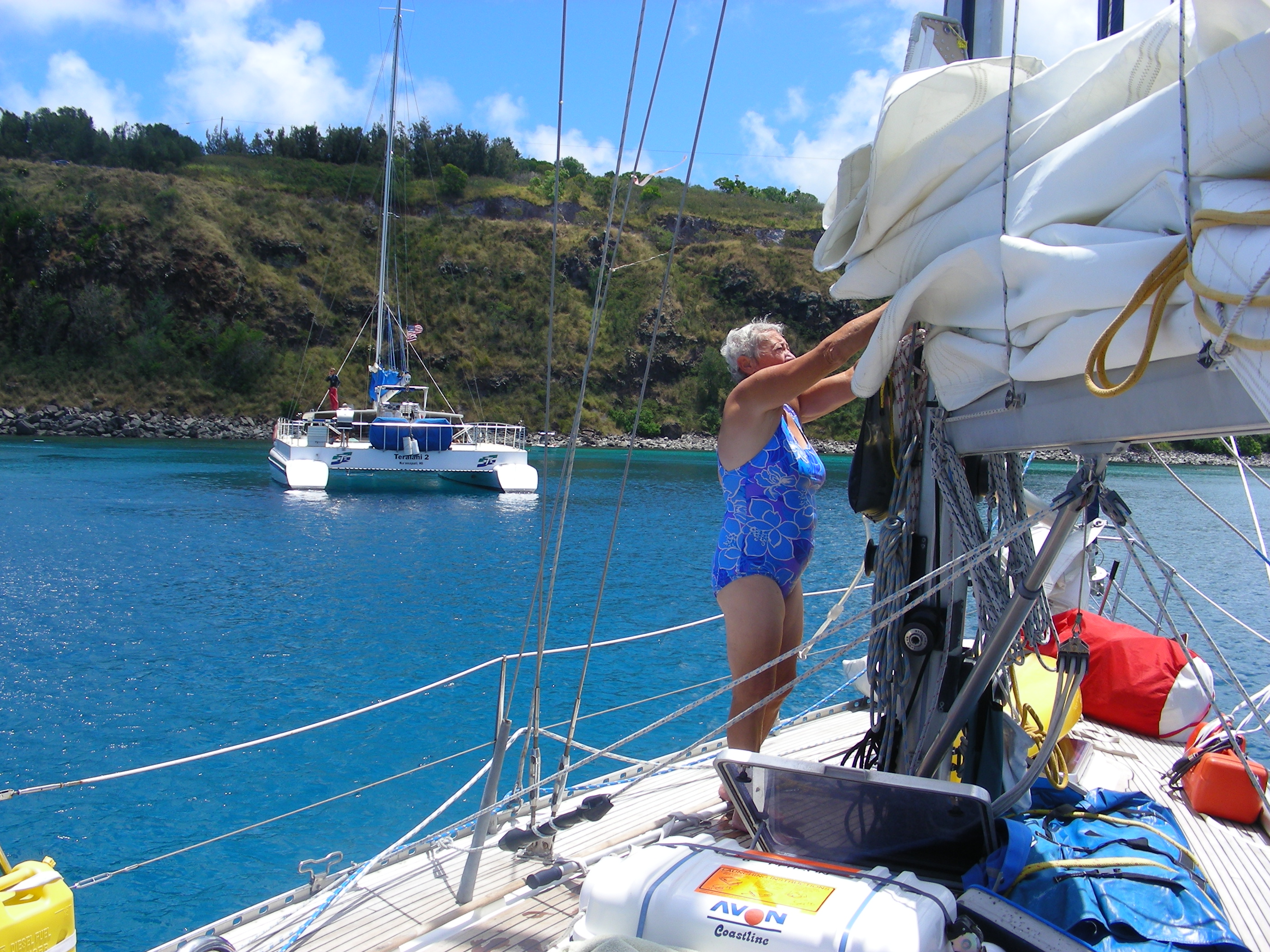 snorkelling around the anchorage oblivious to us coming in and on top of all this a turtle. Yes, a turtle and everyone’s attention focuses on the turtle and here we are trying to control the boat in 30+ knots of wind and squeeze into the anchorage. Success – we made it. The anchor is down and we’re not dragging. Time to relax, straighten things up, get something to eat, swim and prepare for the next 70 miles to Honolulu.