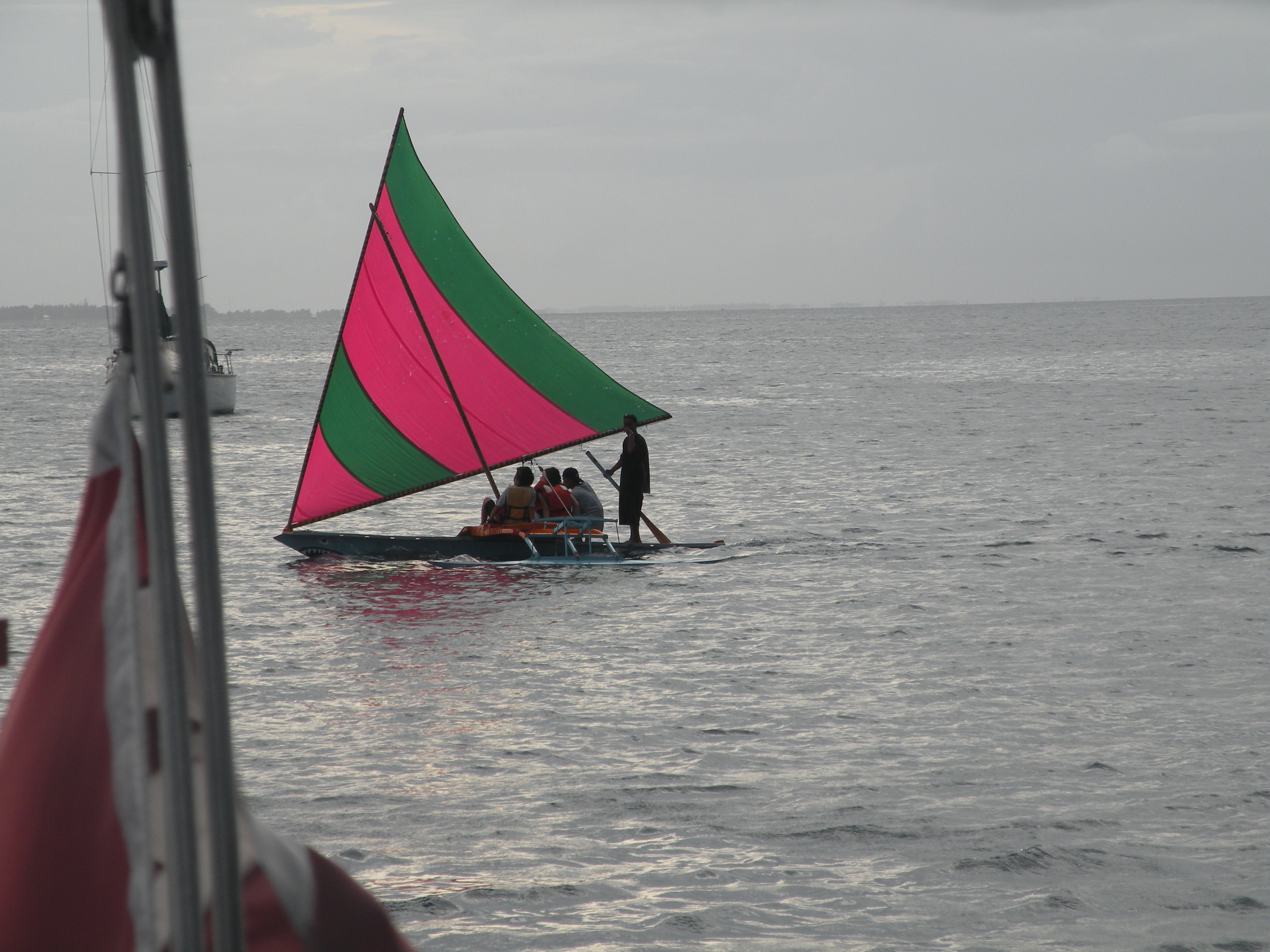 Many times the ITCZ covers the entire horizon from one side to the other and at sea is an ominous reminder that one can be easily crushed. Usually accompanied by large black clouds it contains untold lakes of water ready to pour down on unsuspecting boats or atolls. Here in Majuro one only need look to the east to see whether one is coming or not. It’s usually preceded by an increase in humidity and unsettled skies for sometimes days on end. We’ve just come out of a period with the ITCZ for the last 5 days. The temperature was in the low 30’s and the relative humidity hovered at around 85-90%. One never felt dry, everything dripped inside and outside and the rides ashore would be between squalls and rainfall that filled the dinghy. No, not a nice picture but it is stunning to watch. The pictures accompanying this blog show a little of the black sky, a proa (local sailing vessel)