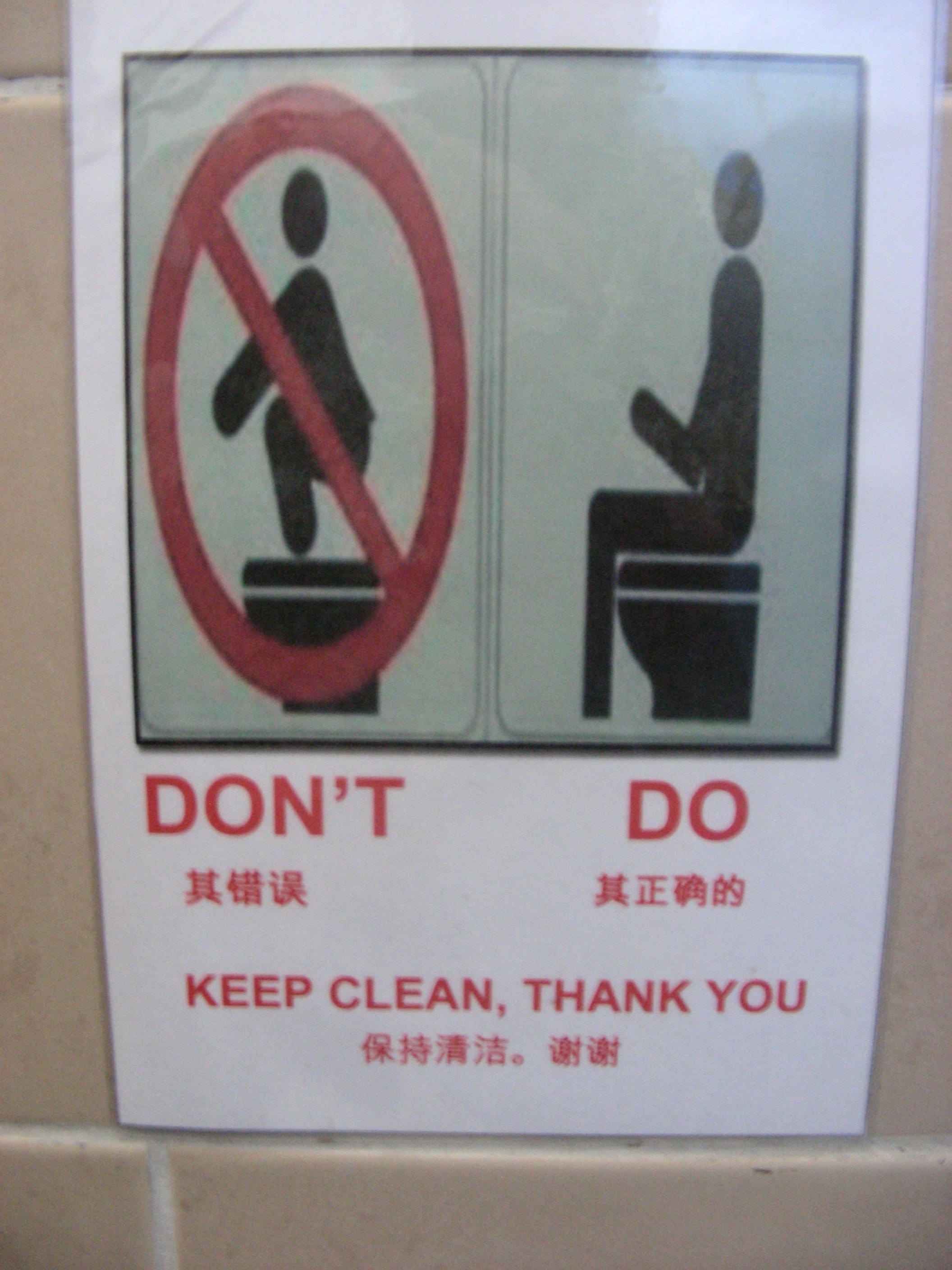 The same sign (English only) is in the women’s washroom at Vancouver Community College. Go figure.