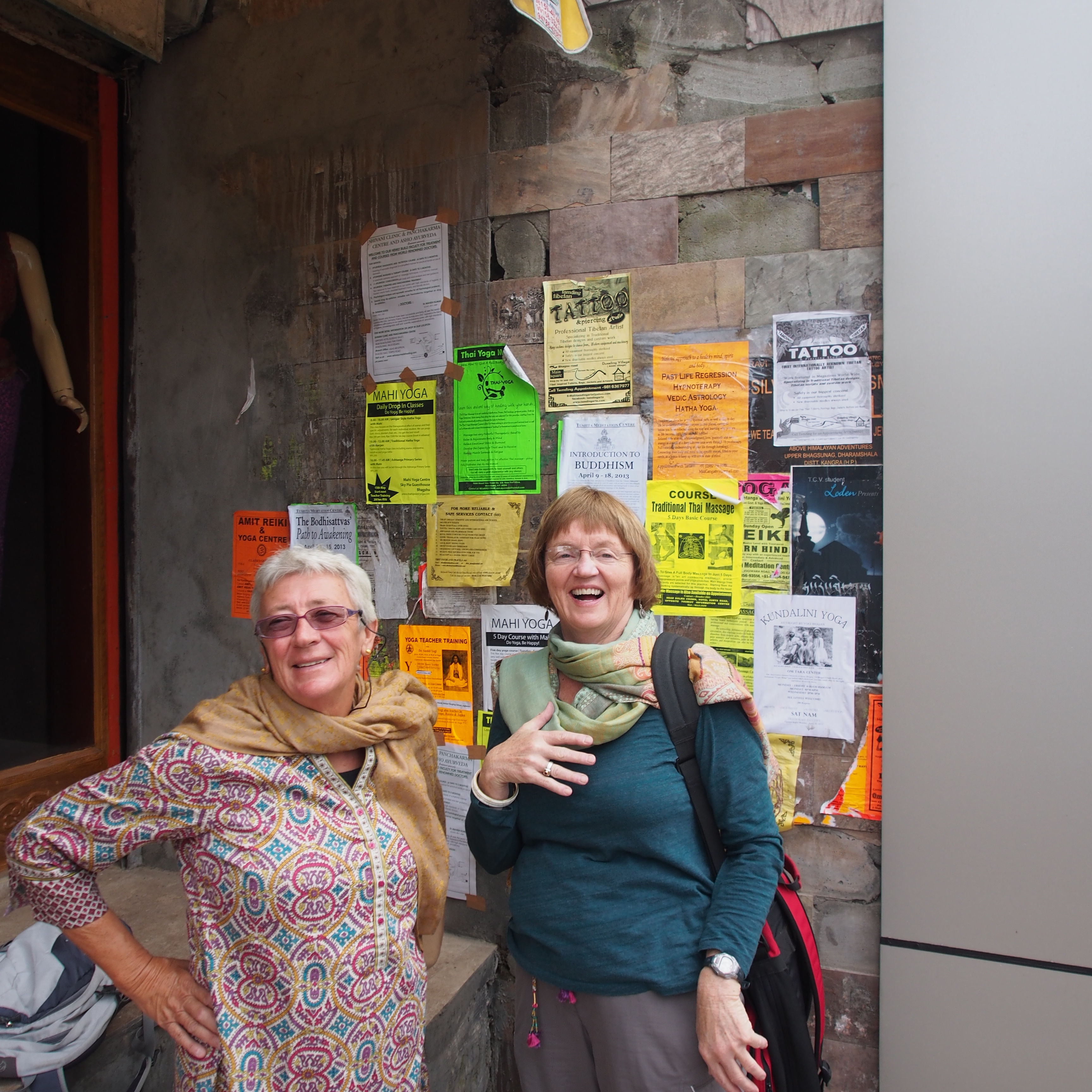 Connie and Gail trying to determine which enlightened course on offer would best suit their needs.