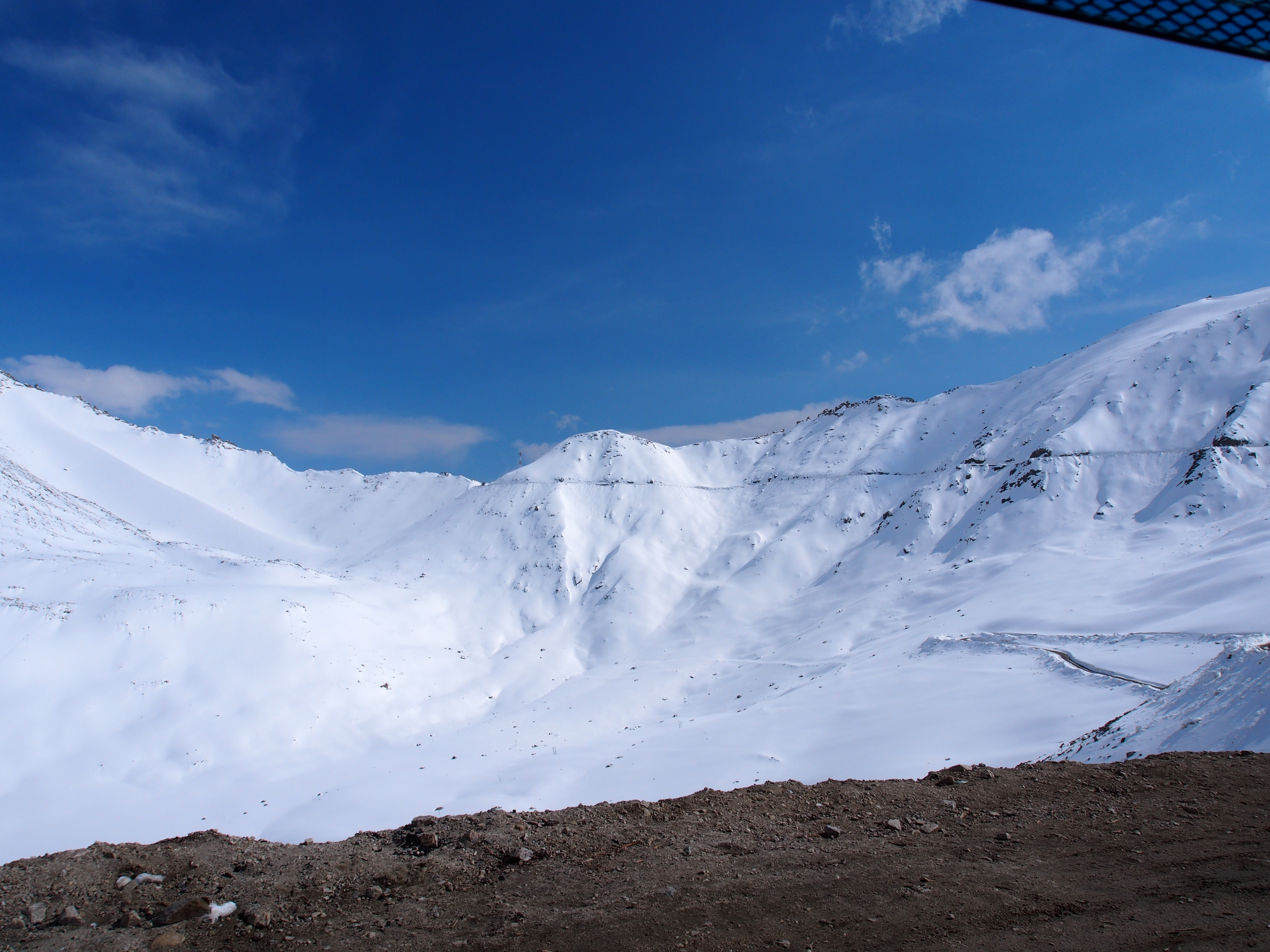 The picture above is of the pass,  Khardung Pass, which we had to go over. Look carefully and you can see the road cut into the side of the mountain. The pass rises to 5,346 metres. Going to the Nubra Valley took ten hours and the return 12 hours. This was for a 160km trip! Both ways we had to use chains but on the return trip we were doing it in the dark. Fears of avalanches, rock slides, frezzing temperatures and mechanical breakdowns kept us all awake.