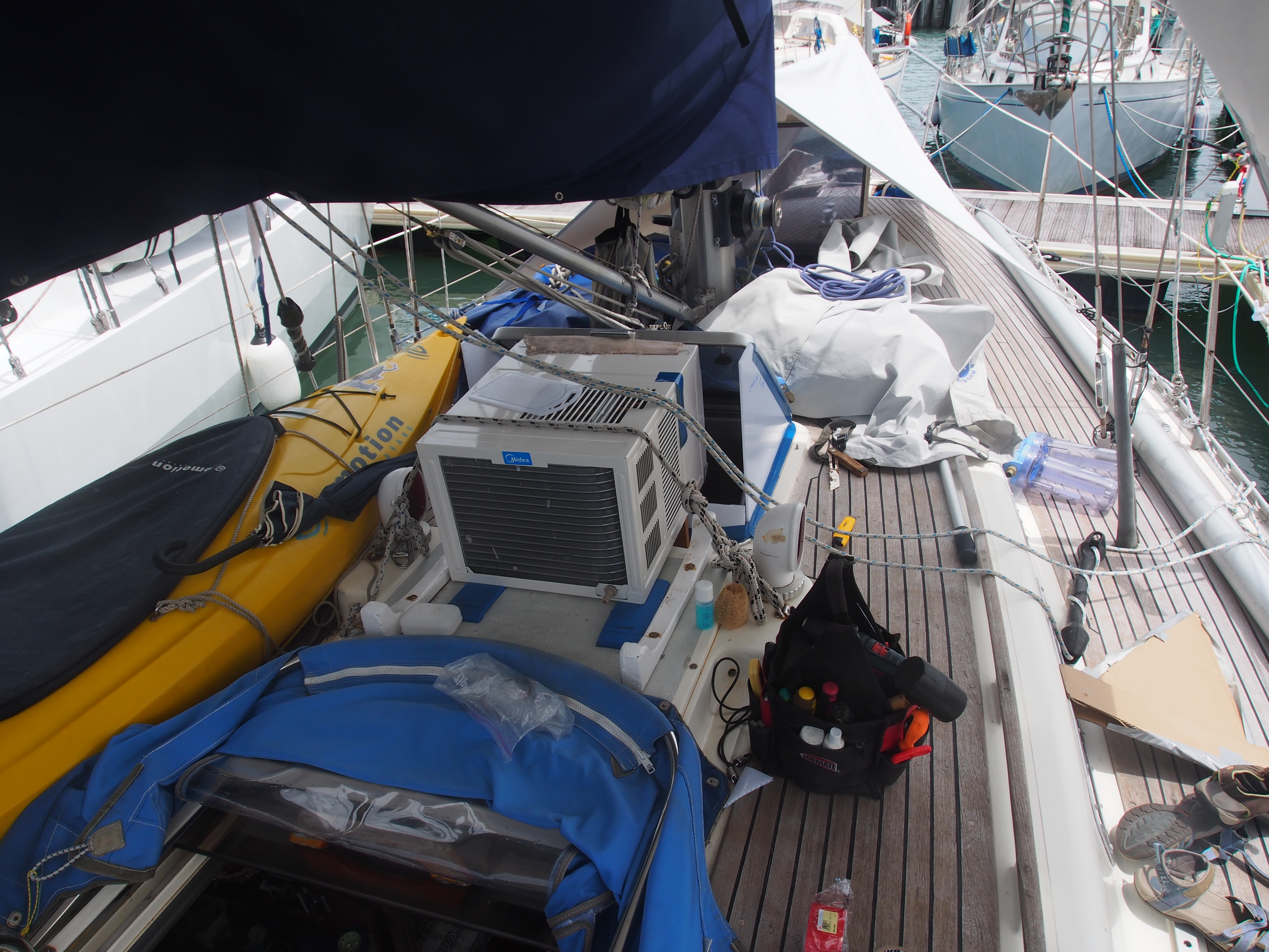 However, it is not enough. We have succumbed and purchased an air conditioner. Many of those sailors who have been here for any length of time have succumbed; that is, apart from the Aussies who seem inured to the searing sun, the lack of wind and the excessive humidity. I think if it wasn’t for the lack of wind I could work with it but especially at night when what little wind there might be disappears then it is downright uncomfortable.