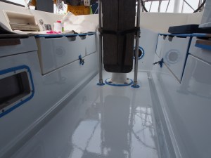 We have now taken off the blue tape and can sit in the cockpit proud of the end result despite all the challenges.  Would we use this paint again?  Time will tell.  If it holds up well under heavy use the answer would probably be yes.  It is difficult to apply but once one has the technique down for ‘rolling and tipping’ it’s actually satisfying to see such a good result.  Yes, we should pat ourselves on our backs.  I guess now though we have to put up with the two-tone nature of the colour in the cockpit with the contrast between the old gelcoat and the new paint.