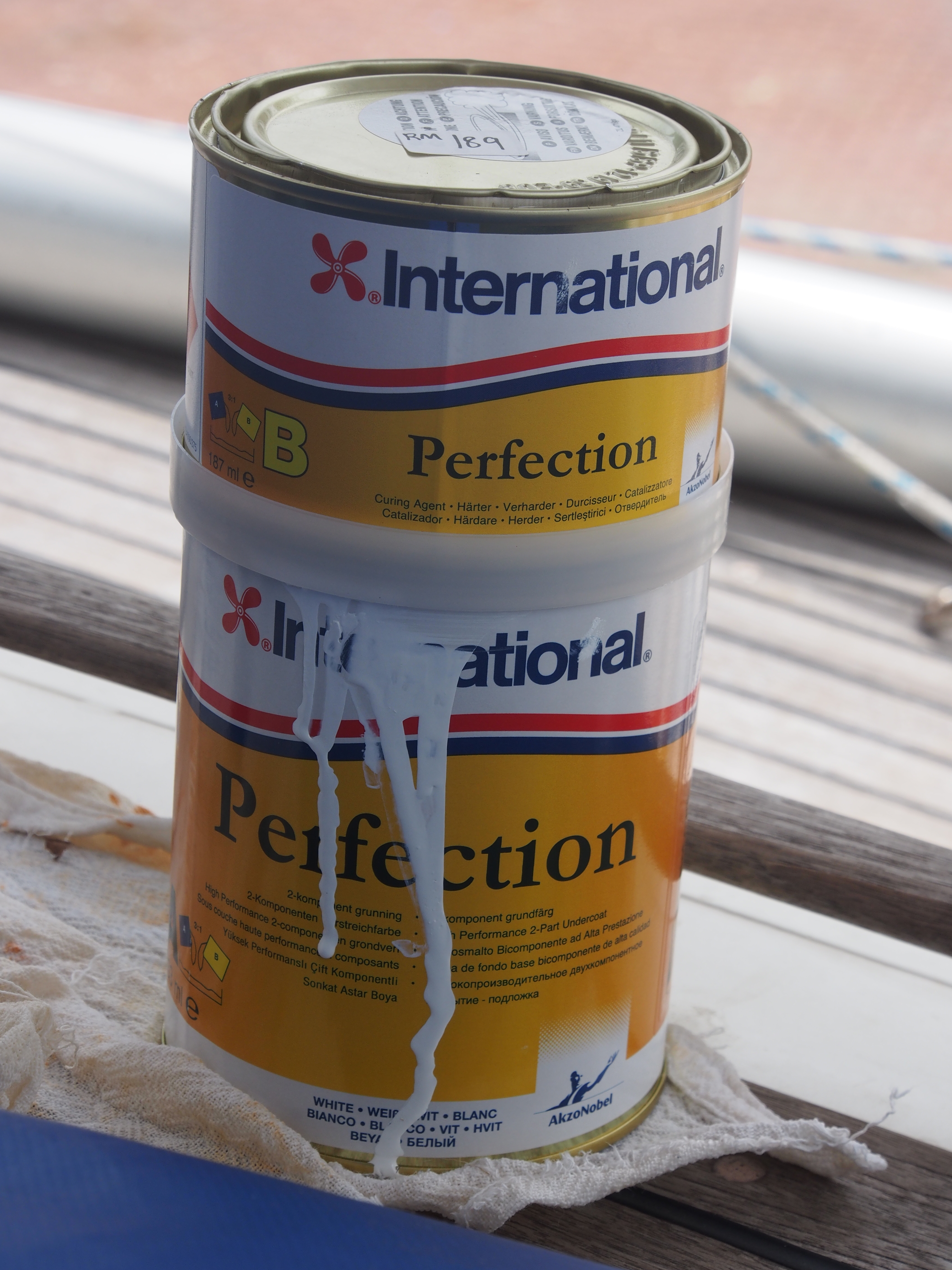 We have now taken off the blue tape and can sit in the cockpit proud of the end result despite all the challenges.  Would we use this paint again?  Time will tell.  If it holds up well under heavy use the answer would probably be yes.  It is difficult to apply but once one has the technique down for ‘rolling and tipping’ it’s actually satisfying to see such a good result.  Yes, we should pat ourselves on our backs.  I guess now though we have to put up with the two-tone nature of the colour in the cockpit with the contrast between the old gelcoat and the new paint.