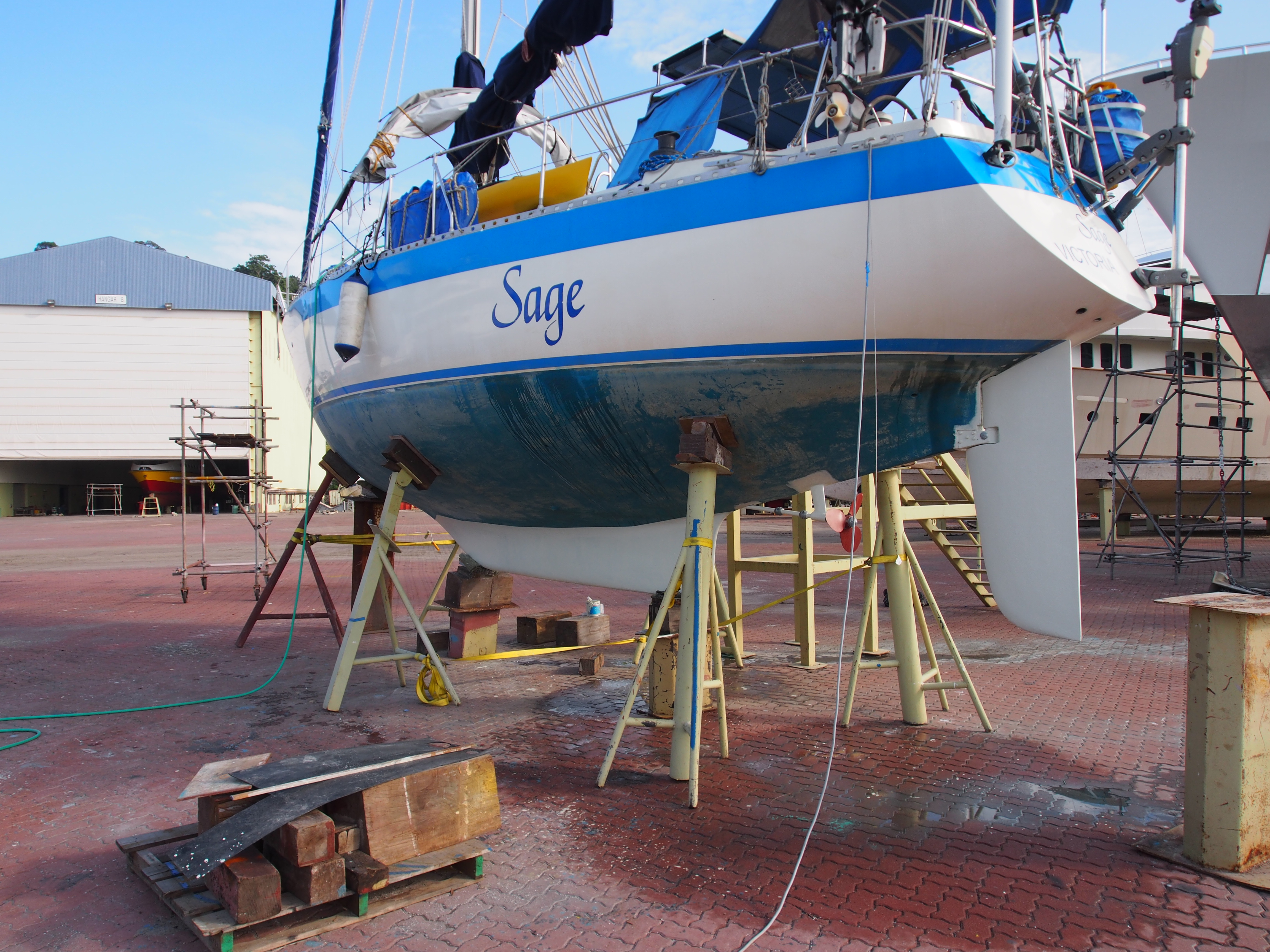 Yes, we are finally back in the water with the centreboard repaired, half the bottom painted with new anti-fouling.  There are now three experimental bottom paints for Sage’s bottom.  We are trying out Jotun paint for the centreboard which is black, a propeller anti fouling paint with is red and finally an International Tri-lux 33 which is white.