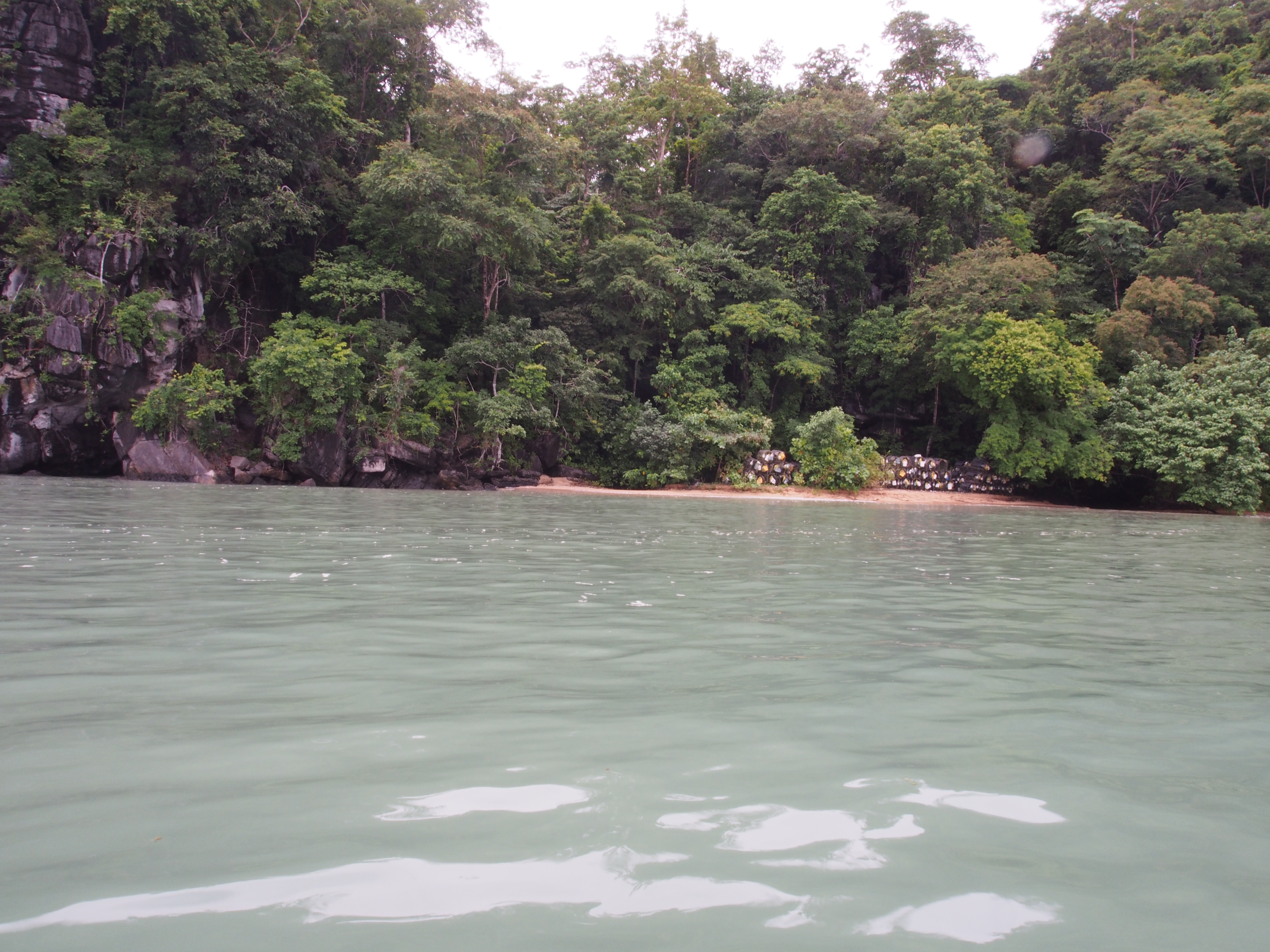 Generally the weather improved as they day went on. However, I will say we were enjoying the overcast, drizzle and cooler temperature. All a relief from the heat and humidity and we weren’t missing the air conditioner. We both were saying it reminded us of the Pacific Northwest but just warmer. The landscape was similar in that here it is a very rocky shoreline where the vegetation drapes itself over the water’s edge trying to suck the ocean dry in its never-ending quest to grow and take over territory. There’s debris floating everywhere; large segments of bamboo, palms floating vertically, scrap wood and all along with dead squid and numerous other pelagic beings (as well as fishing nets on the rocks).