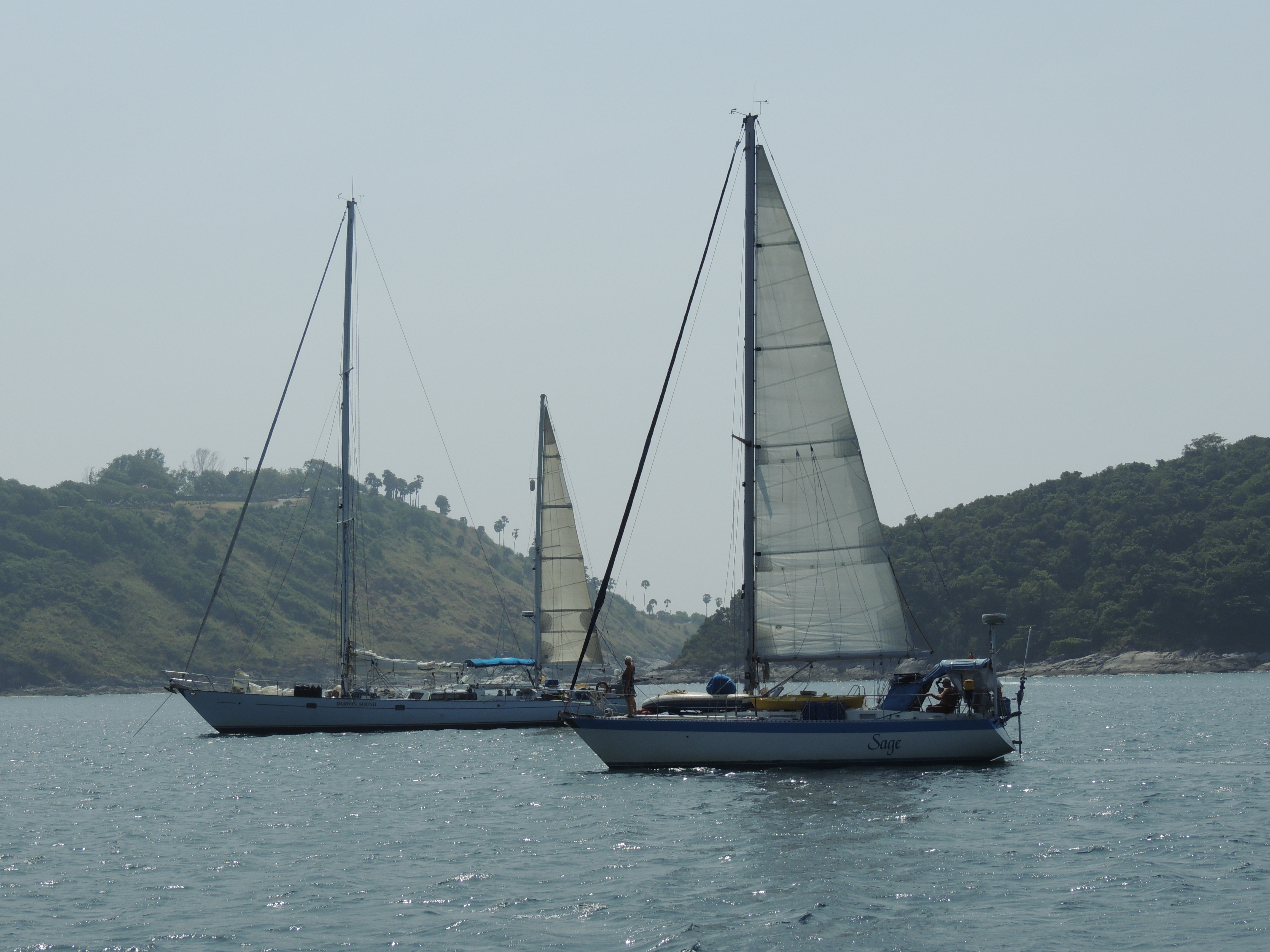 Here’s a picture of Sage sailing into Nai Harn Bay but in the background is an old acquaintance – Darwin Sound. We met Darwin Sound in !Alert Bay on our way back from Japan in 1990. We weren’t in Sage but onboard our old 8 metre boat Hejira. We took out their spinnaker pole to measure it up against Hejira and their spinnaker pole was longer than Hejira!