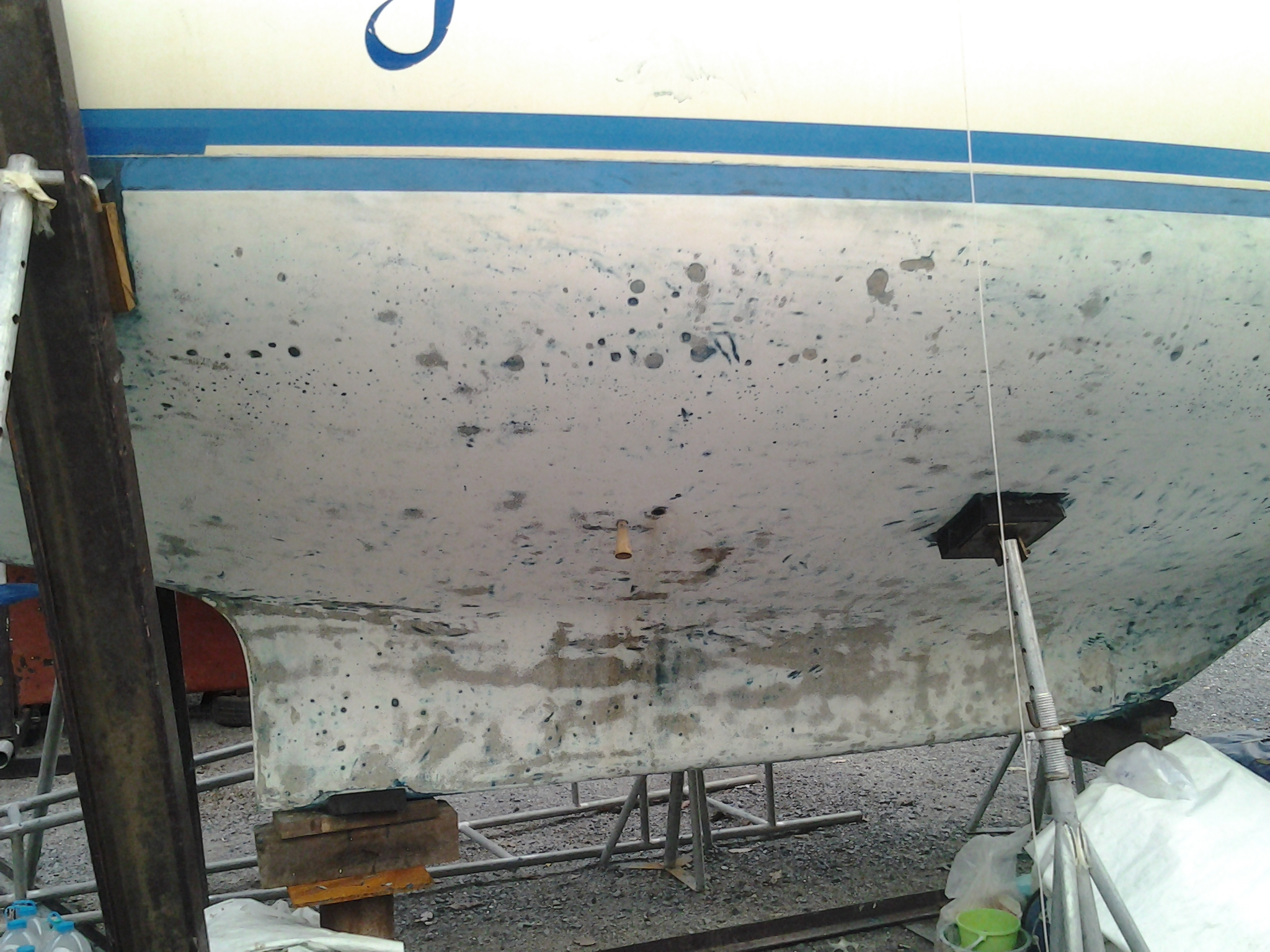 Another view after all the anti fouling has been removed and what remains is an old ‘barrier coat’ to protect the fiberglass