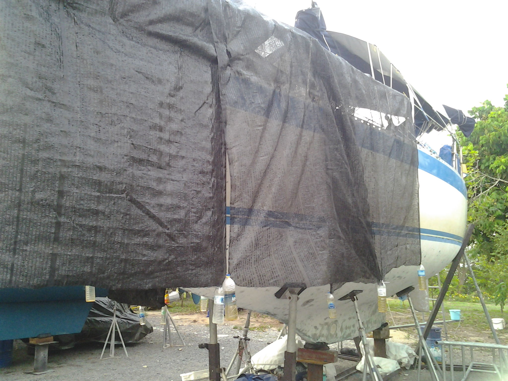 To finally put the boat into storage we usually cover the entire boat with shadecloth. We are partway there at this point as we have finished all the jobs in the forward half of the boat. In the next couple of days we will finally don the aft section and that should protect the fiberglass and the teak decks from the punishing sun and keep the boat a little cooler.