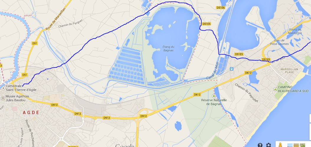 We were now ‘out in the open’. The day was blistering. The bitumen trail was hot but traffic at a minimum. Eventually we made our way around the Etang, or salt marsh, and back on to the direct route between Agde and Sete. I have to say that without the tablet
