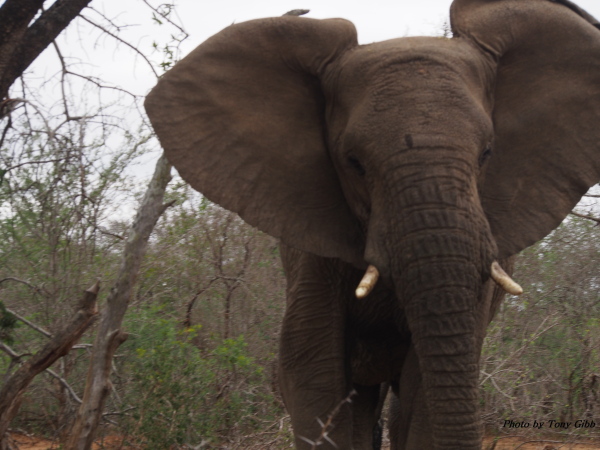 Another animal in the middle of the road.  He flapped his ears at us, lifted his tusk and then roared. We quickly backed up and got out of his way staying at a respectful distance.