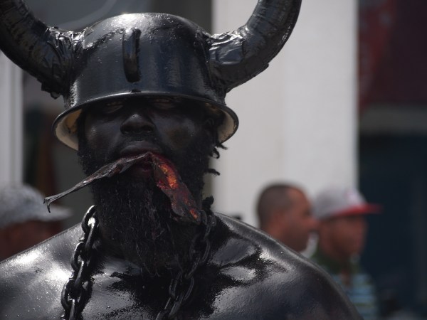 It’s party time on Carriacou. Yes February is Carnival time and in town early one morning everyone was still partying on the main street. This guy was slathered in                                                                         used motor oil
