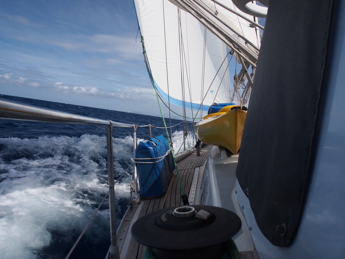 The beginning of the winter season winds blow strongly and as the season progresses the winds lighten. They vary from NE to SE and depending on whether you are going south or north one waits for the more favourable wind as it’s either going to be hard on the wind or just forward of the beam. But it’s always going to be rough between the islands.