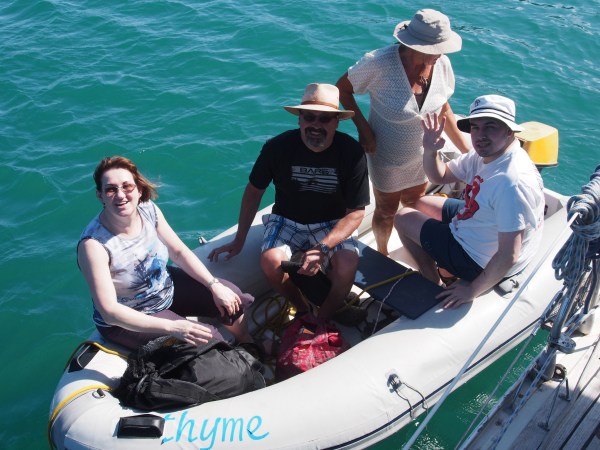 Trying to fit the family in the dinghy for an outing to Green Island –                                   Debi, Cliff, Connie and Nick