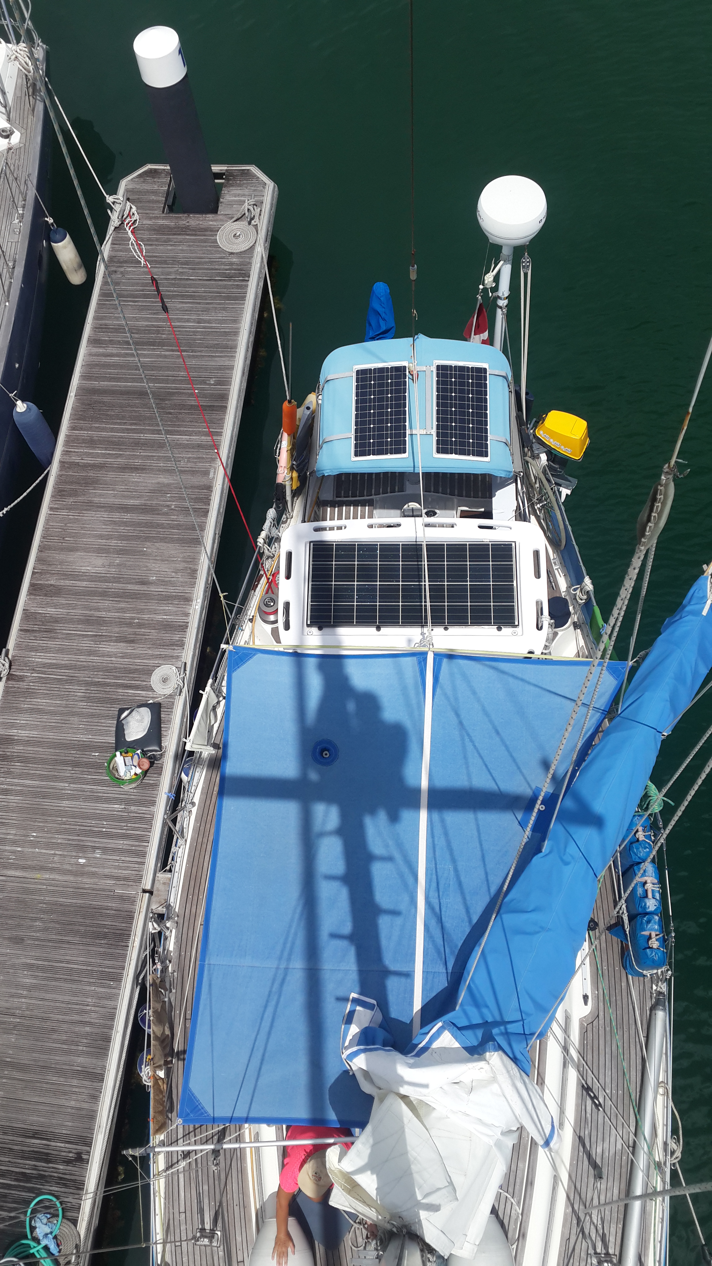 Checking the rigging. Bird’s eye view of the solar panels that have fun our electrical system for 9 years without fail i.e. refrigeration, entertainment, lights, communications. Who says we can’t stop using fossil fuels?