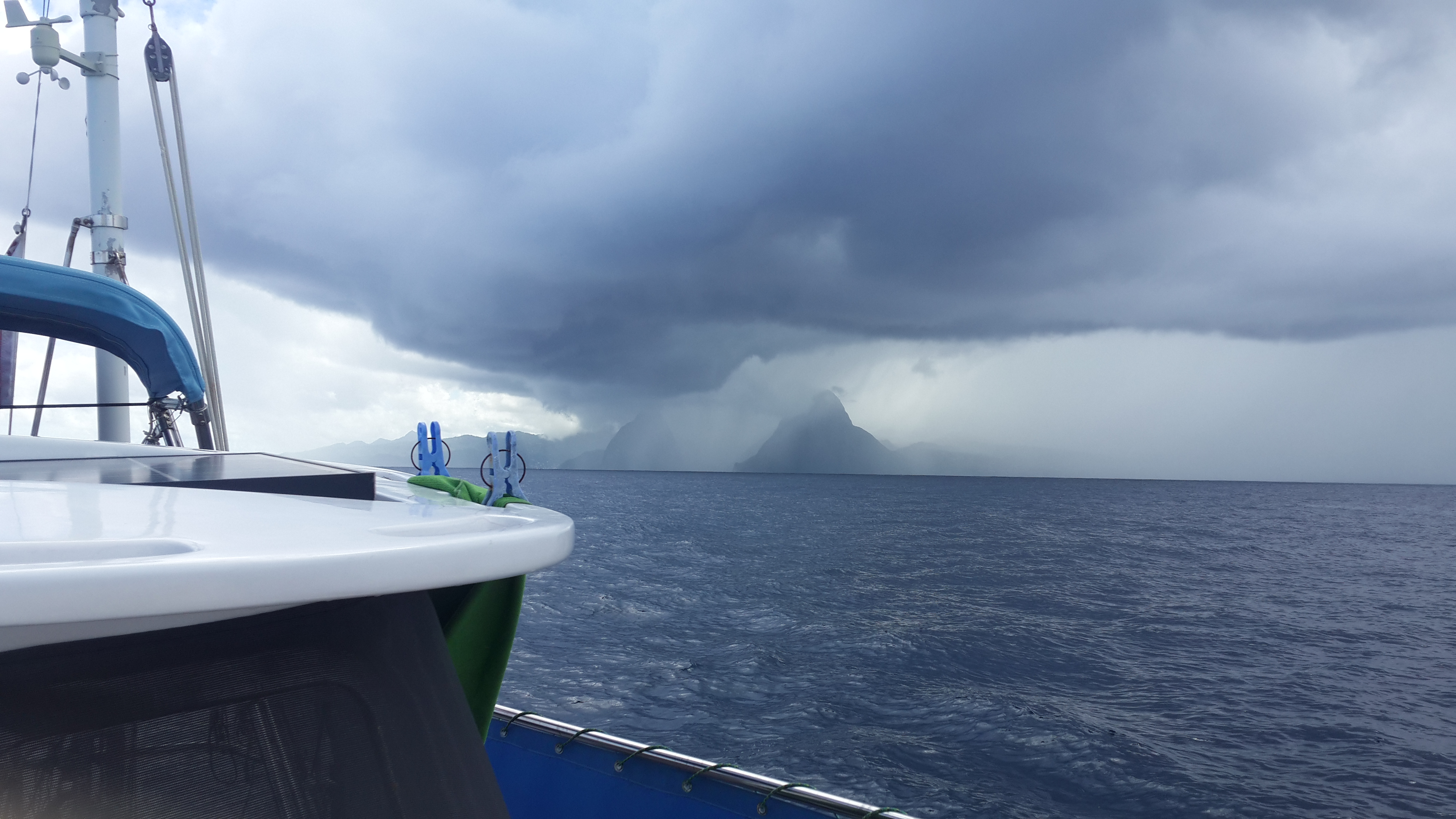 Sailing between St. Lucia and St. Vincent and waiting to get clobbered by wind and rain. Luckily it wasn’t too bad