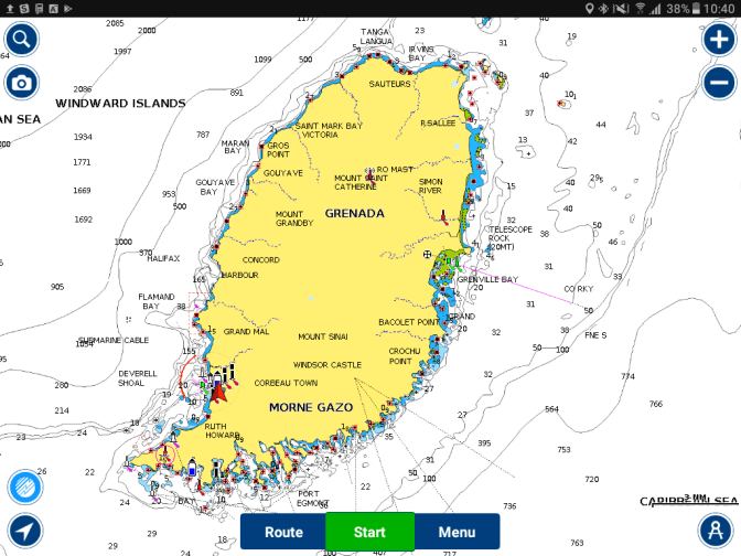 Sailing north we passed by Grand Mal but with the mountains of central Grenada towering to the east the wind soon died and dark, black threatening clouds tumbled down the leeward slopes providing gusts of rain soaked winds to batter us with and then depart leaving us drifting in circles. There was more calm than wind so we decided to motor for a while. Motoring is not what I like but with still a way to go we decided this would be the best tactic. Engine started well, speed was good, skies cleared waiting for the next gust and since the engine was running it was time to power up some of the portable devices.
