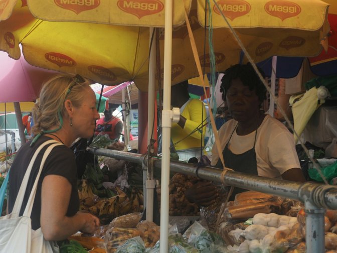 Behan, from SV Totem, shopping in the St. George market and getting some cooking advice