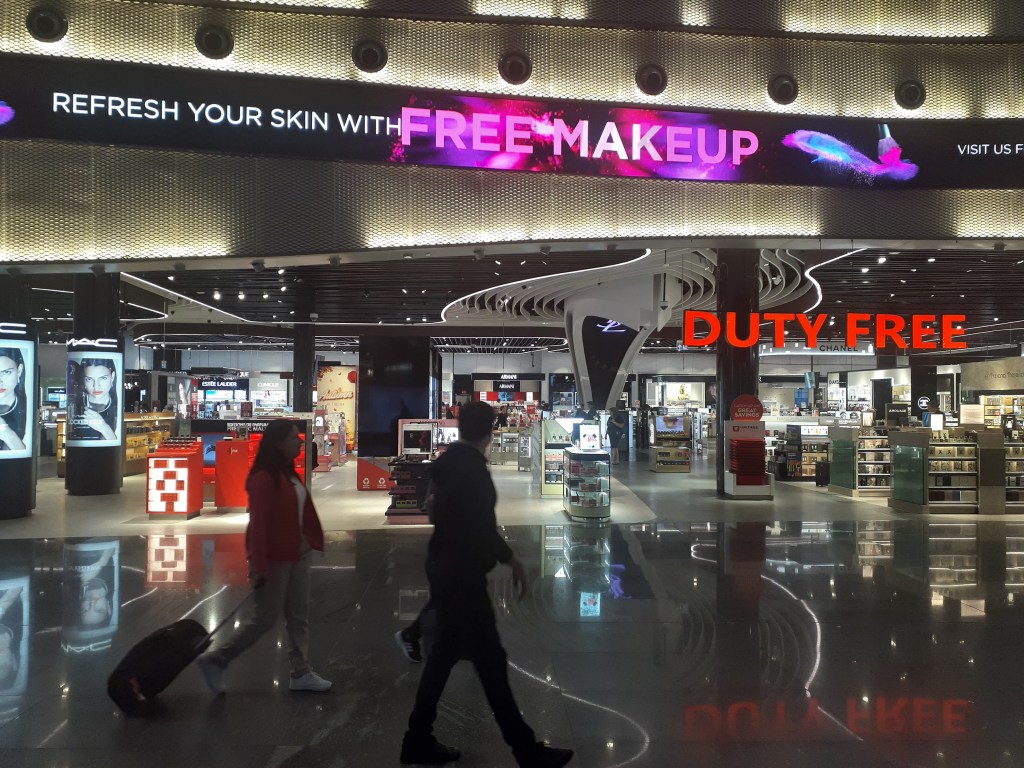 Ah yes, it’s all duty-free, they say, but then it’s marked up to prices beyond what one would pay in a shop downtown. The place bristles with ads for flying, showing happy customers in lie down flat seats being served sumptious meals by smiling cabin staff.