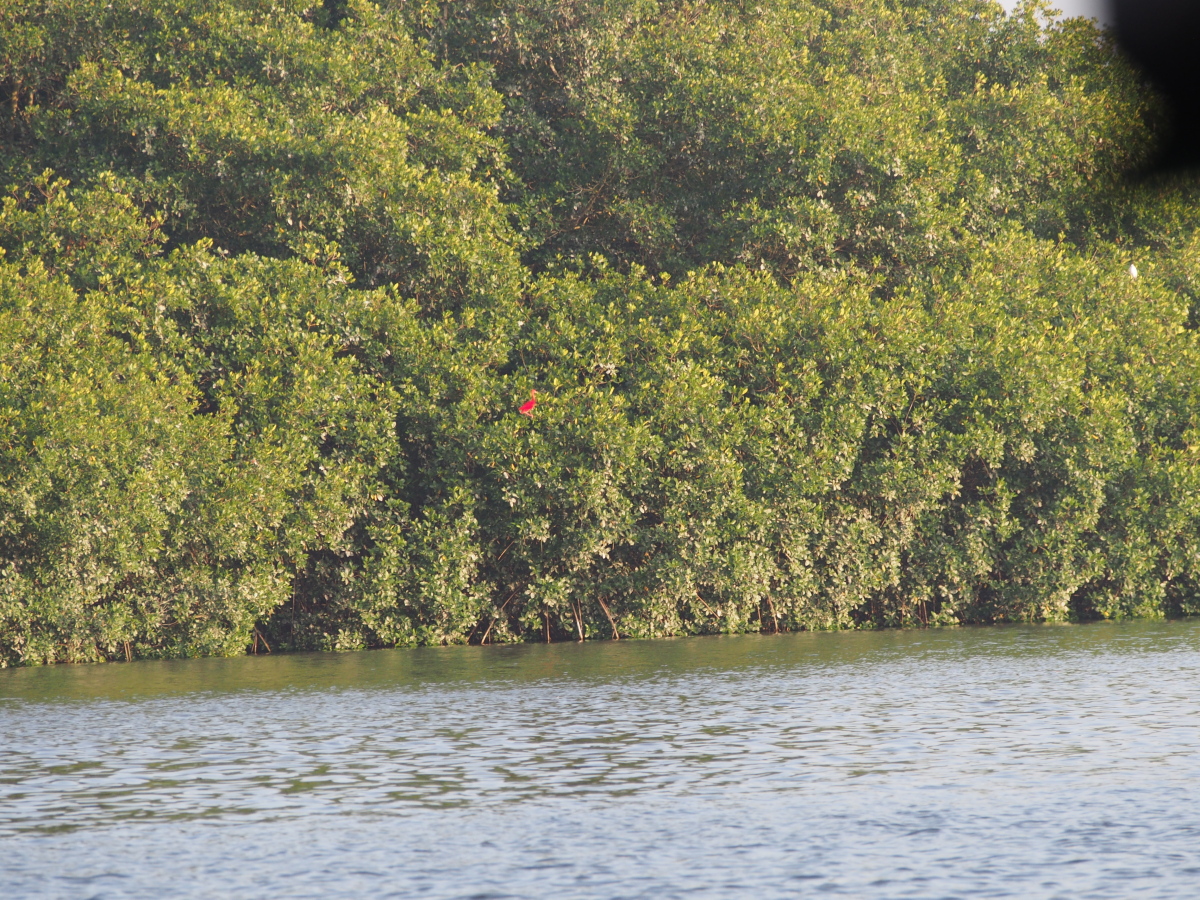 Initially, there were no scarlet ibises to be seen but there were a few great herons and egrets all in white standing out against the mangrove forested background. Around 1730hrs a lone scarlets ibis flew in to roost on the island in front of us. Okay, we were impressed but where were the others? Slowly individual ibises appeared increasing the population on the higher levels of the treetops.