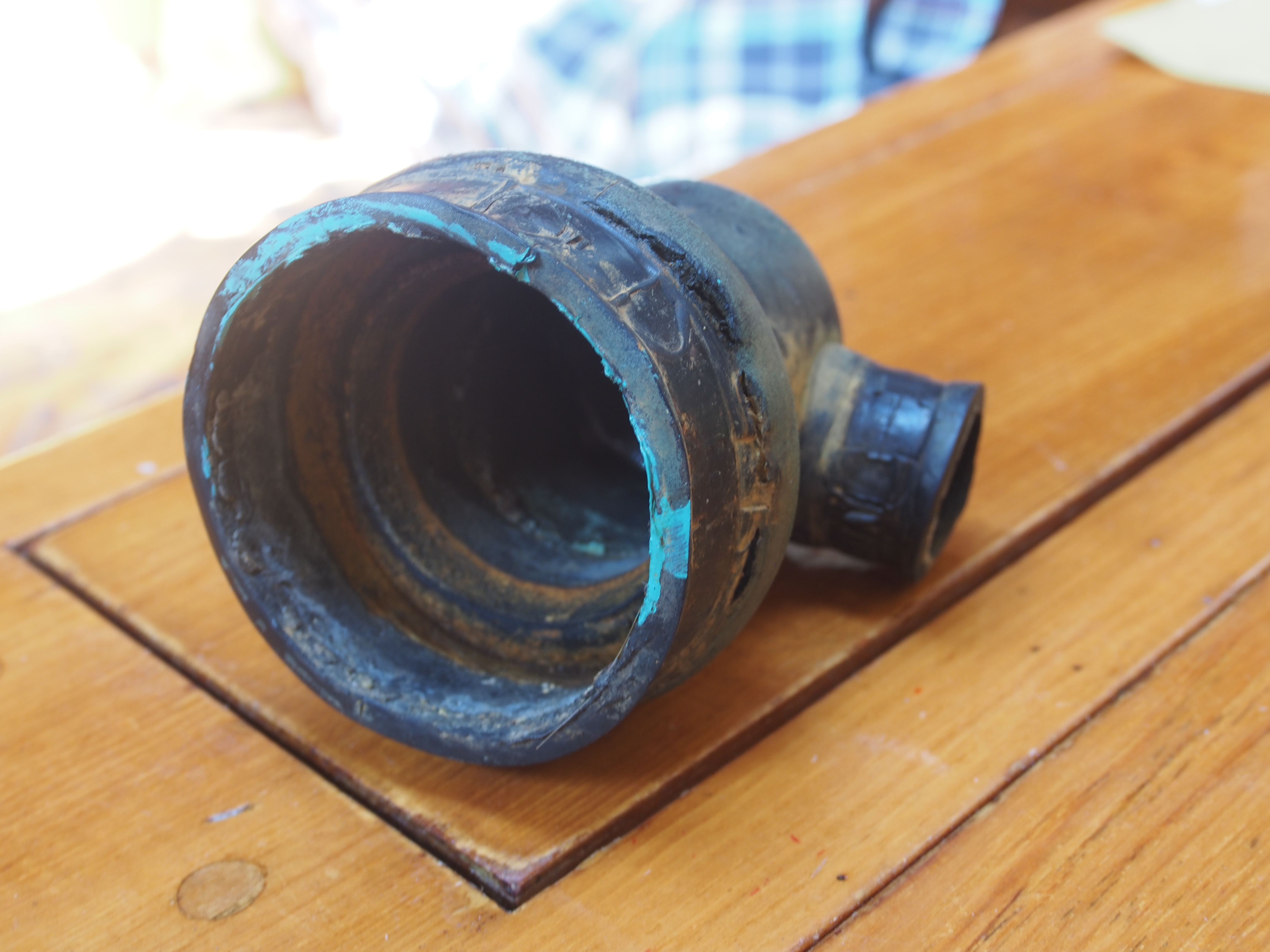 We went to start the engine to go over to the mooring but I noticed that the water coolant was low and I had just filled it the day before. Ummm – now what. Sure enough a rubber hose connector had rotted through and squirted the water all over the engine. This must have finally collapsed totally when we had the engine going to stop our dragging.