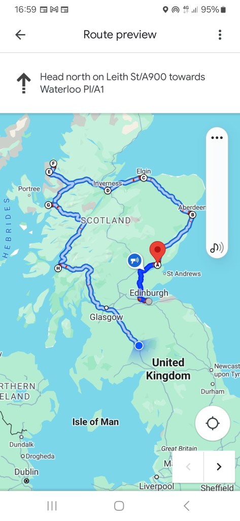 It was time, after visits to Dundee, Edinburgh and Inverness to head out to the wilder places of Scotland. Here is a very rough representation of our routing: