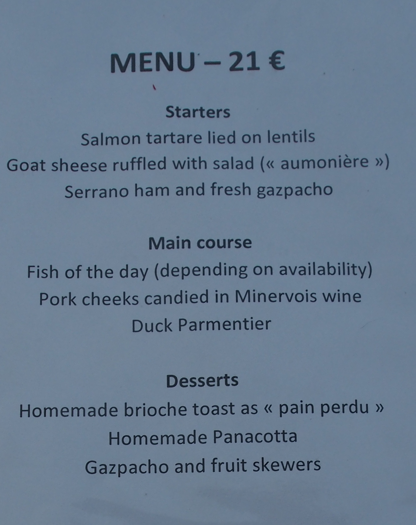 Then it was time for dinner. Wow – great little place just outside the hotel, music during dinner and a wonderful table d’hote – see picture below for the starter, the wine and the dessert which were all excellent. High marks to this restaurant, L’O a la Bouche, my mouth is watering.