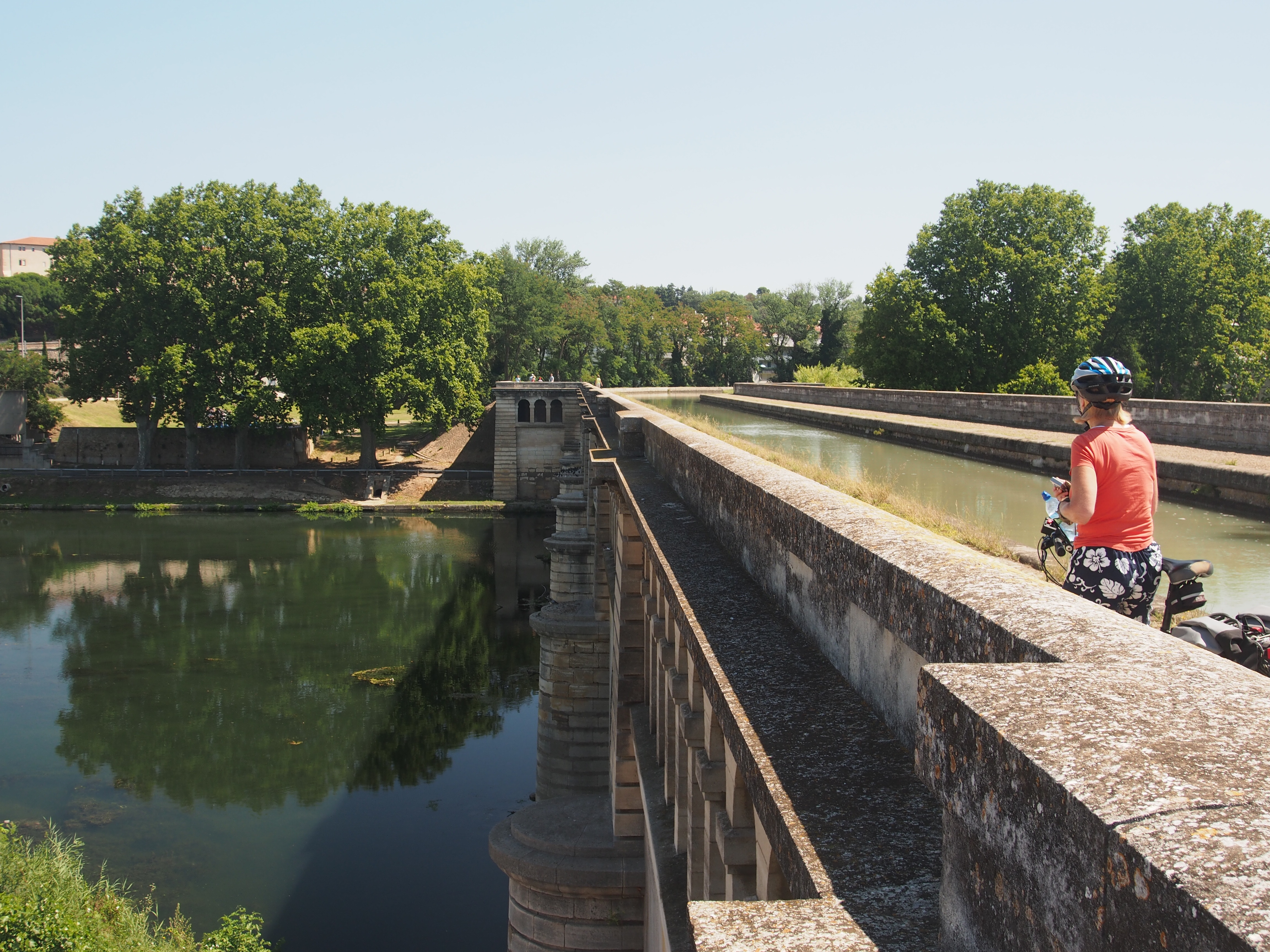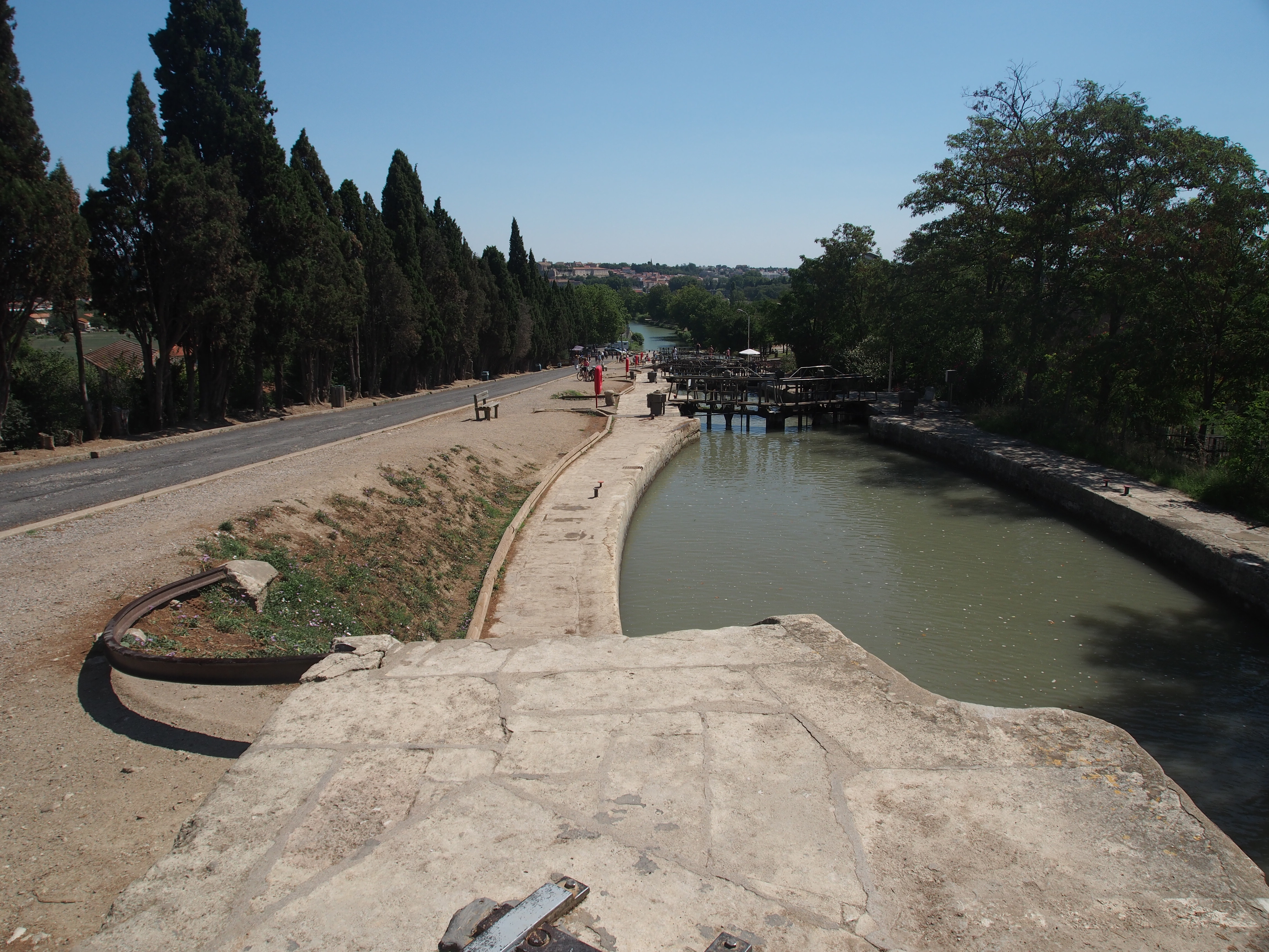 The guide-book we were using, Cycling the Canal du Midi by Declan Lyons, warned us about the difficulty of finding our way past Beziers as the Canal takes many twists and turns and can be confusing. However, what amazed us again was the engineering that went into this section of the canal. Not only were there sections of the canal that incorporated multiple locks in one place