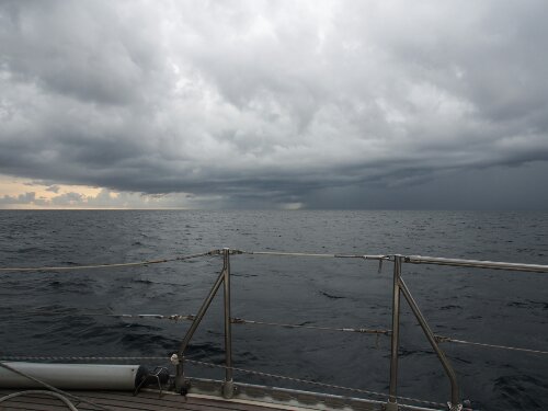 Often enough the afternoons see clouds thickening, darkness descends in the distance and the sun disappears and humidity rises. Slowly the clouds roll across the sky, the humidity rises even higher and the first raindrops start to fall. Within thirty minutes the sky feels like it is falling as the streaks of gray are torn from the clouds above and descend on everything trying to scrub the earth clean. Temporary shade cloths are gathered in, hatches closed and fans put on high down below to try to dispel the humidity and give some relief to the stuffiness as a result of closing everything up.
